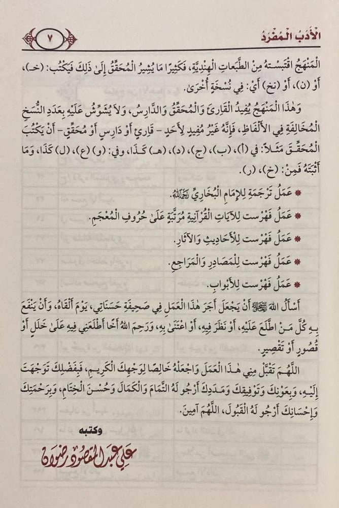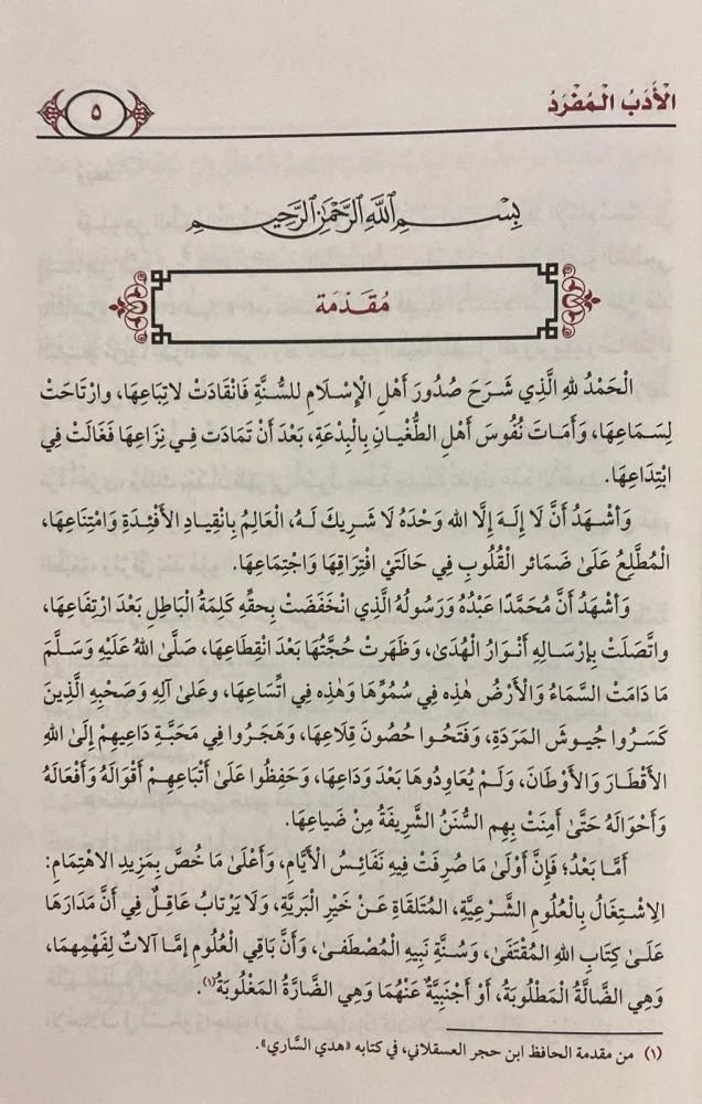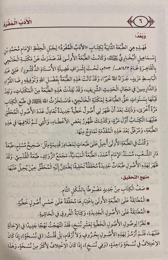 فَهَذِهِ هِيَ الطَّبْعَةَ الثَّانِيَةُ لِكِتَابِ الأَدَبُ الْمُفْرَدُ لِجَبَلِ الْحِفْظِ الإِمَامِ مُحَمَّدِ بْنِ إِسْمَاعِيلِ الْبُخَارِيُّ وَلَهُ، وَكَانَتْ الطَّبْعَةُ الأُولَىٰ قَدْ صَدَرَتْ عَنْ مَكْتَبَةِ الْخَانْجِي بِالْقَاهِرَةِ عَامَ ١٤٢٣هـ / ٢٠٠٣م ، تَحْتَ إِشْرَافِ فَضِيلَةِ الأُسْتَاذِ الدُّكْتُورِ / عَلِيٌّ عَبْدِ الْبَاسِطِ مَزَيدٍ، جَزَاهُ اللهُ خَيْرًا ، وَقَدْ نَالَتْ هَذِهِ الطَّبْعَةُ بِفَضْلِ اللَّهِ وَتَوْفِيقِهِ رِضَا القُرَّاءِ وَالدَّارِسِينَ فِي مَجَالِ الْحَدِيثِ الشَّرِيفِ، وَقَدْ نَفِدَتْ هَذِهِ الطَّبْعَةَ مِنَ الْمَكْتَبَاتِ، وَنَفِدَ قَبْلَهَا بِسَنَواتِ حَقُّ الطَّبَاعَةِ لِمَكْتَبَةِ الْخَانْجِي، فَاسْتَخَرْتُ اللَّهَ عَبَرَكَ فِي طَبْعِ الْكِتَابِ مَرَّةً أُخْرَى، وَذَلِكَ بَعْدَ أَنْ ظَهَرَ لِي أُصُولٌ خَطِيةٌ جَدِيدَةٌ تُعَادِلُ عَدَدَ الأُصُولِ الْمُحَقِّقِ عَلَيْهَا الْكِتَابُ أَوَّلَ مَرَّةٍ، وَكَذَلِكَ ظُهُورُ بَعْض الأَخْطَاءِ، وَالَّتِي تَمَّ تَلَافِيهَا فِي هَذِهِ الطَّبْعَةِ، وَمُرْفَقٌ بَعْدَ هَذِهِ الْمُقَدِّمَةِ نَمَاذِجٌ مِنْهَا .