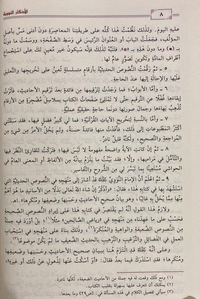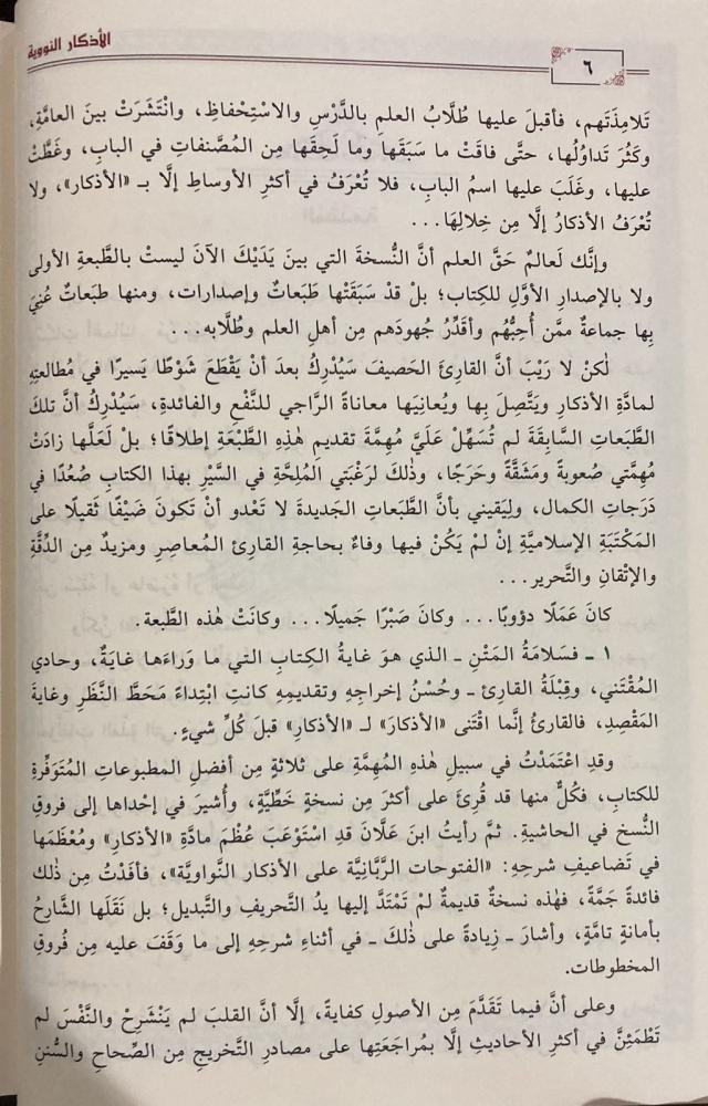 ۱ – فَسَلامَةُ المَتْنِ – الذي هو غايةُ الكِتاب التي ما وَراءَها غايَةٌ، وحادي المُقْتَني، وقِبْلَةُ القارِئ – وحُسْنُ إخراجه وتقديمِهِ كانتِ ابْتِدَاء مَحَطَّ النَّظَر وغايةَ المَقْصِدِ، فالقارئُ إِنَّمَا اقْتَنى الأذكار» لـ «الأذكار» قبلَ كُلِّ شيءٍ