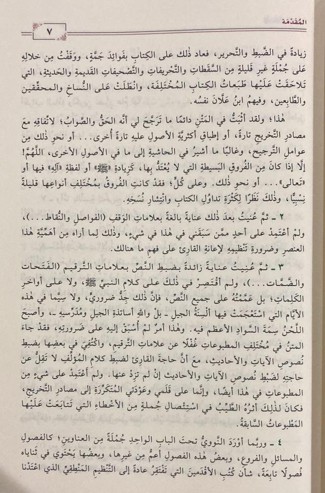 هذا ؛ ولقد أثْبَتُ في المَتْنِ دائما ما تَرَبَّحَ لي أنَّه الحَقُّ وَالصَّوابُ ؛ لاتفاقِهِ معَ من مصادر التخريج تارةً، أو إطباق أكثريَّةِ الأصول عليه تارةً أخرى … أو ذلك عواملِ التَّرجيح، وغالبًا ما أشير في الحاشية إلى ما في الأصول الأخرى، اللَّهُمَّ ! إلا إذا كانَ مِن الفُروقِ البسيطة التي لا يُعْتَدُّ بها كَزيادة » أو لفظة «آلِهِ» فيها أو «تعالى» . . . أو … أو نحو ذلك . وعلى كُلِّ؛ فقد كانتِ الفُروقُ بِمُخْتَلِفِ أنواعها قليلةً نِسْبِيًّا، وذلكَ نَظَرًا لِكَثْرَةِ تداول الكتابِ وانْتِشارِ نُسَخِهِ.