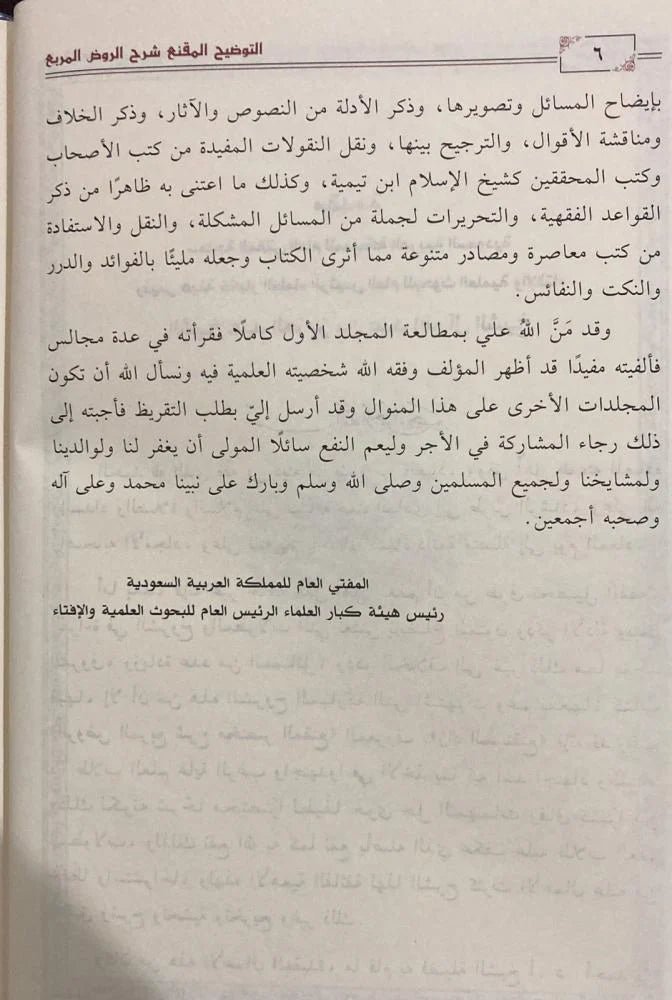 بإيضاح المسائل ،وتصويرها وذكر الأدلة من النصوص والآثار، وذكر الخلاف ومناقشة الأقوال، والترجيح بينها، ونقل النقولات المفيدة من كتب الأصحاب وكتب المحققين كشيخ الإسلام ابن تيمية وكذلك ما اعتنى به ظاهرا من ذكر القواعد الفقهية والتحريرات لجملة من المسائل المشكلة، والنقل والاستفادة من كتب معاصرة ومصادر متنوعة مما أثرى الكتاب وجعله مليئا بالفوائد والدرر والنكت والنفائس . وقد مَنَّ الله علي بمطالعة المجلد الأول كاملًا فقرأته في عدة مجالس فألفيته مفيدًا قد أظهر المؤلف وفقه الله شخصيته العلمية فيه ونسأل الله أن تكون المجلدات الأخرى على هذا المنوال وقد أرسل إلى بطلب التقريظ فأجبته إلى ذلك رجاء المشاركة في الأجر وليعم النفع سائلا المولى أن يغفر لنا ولوالدينا ولمشايخنا ولجميع المسلمين وصلى الله وسلم وبارك على نبينا محمد وعلى آله وصحبه أجمعين .