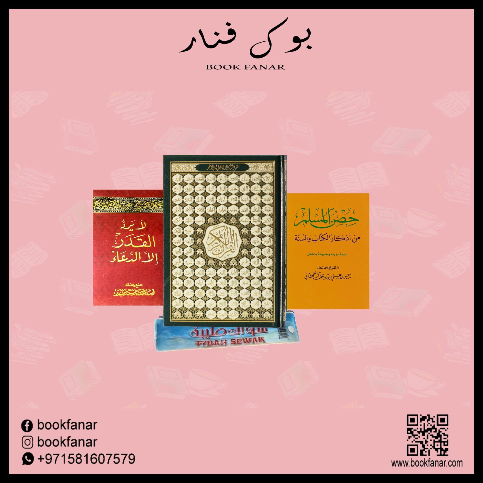 المجموعة الإسلامية – للهدايا والتوزيعات المصحف بالرسم العثماني 14×20 سم حصن المسلم حجم كف اليد لا يرد القدر إلا الدعاء سواك طيبة 1 حبه المصحف بالرسم العثماني برواية حفص عن عاصم غلاف أسماء الله الحسنى ورق شاموا مقاس 14*20 سم الغلاف جلد فاخر والطباعة حراري ذهبي حصن المسلم حصن المسلم – أدعية من القرآن والسنة. (وتُعرف أيضًا باسم “قلعة المؤمن” أو حصن المسلمين) وهذا كتيب رائع جدًا يحتوي على العديد من الأدعية الصحيحة التي يدعو بها المسلم يوميًا وفي المناسبات الخاصة. ملاحظة المؤلف… هذا الكتاب هو ملخص لعملي السابق بعنوان الذكر والدعاء والعلاج بالرقية من كتاب السنة. لقد اخترت فقط قسم كلمات الذكرى لهذا الاختصار حتى يكون صغيرًا وسهل الحمل. وتحقيقاً لذلك، ذكرت نص كلمات الذكر فقط بدلاً من الحديث بأكمله. كما اقتصرت على ذكر مرجع أو مرجعين فقط من الكتاب الأصلي لكل حديث. وعلى من أراد أن يعرف الصحابي الذي روى حديثاً معيناً، أو معلومات إضافية عن مكان تسجيله، أن يرجع إلى العمل الأصلي (المذكور أعلاه). سعيد بن علي بن وهف القحطاني لا يرد القدر إلا الدعاء جمع و تحقيق : أسامة شبندر لا إله إلا الله، الأقدارُ منها أقدارٌ مرتَّبة على أسباب، والأقدارُ والأسبابُ تتدافعُ، يقول: وأحزمُ النَّاس مَن يردّ القدرَ بالقدرِ، كلّ الأمور الشّرعيَّة والعاديَّة كلّها فيها تدافع، فقدرُ الجوع يُرَدُّ بقدرِ الطَّعام والأكل والعطش والمرض كلّها فيها تدافع، والدَّافعُ والمدفوعُ كلّه مقدَّر. فنجي [نأتي] نتدبَّر: لا يردُّ القدرَ إلَّا الدّعاءُ ؛ ليس المرادُ القدرَ المحتوم، فالقدرُ الذي سبقَ علمُ الله بأنَّه يكونُ: لا يردّه شيءٌ، عُلِم ؟ ظاهر ؟ سمعتم يا إخوان ؟ القدرُ الذي علمَ اللهُ أنَّه يكون ولابدّ: لا يردُّه شيءٌ، ما في .. يعني هذا ما في أسباب تدفعه ليس له أسباب، إذًا القدرُ الذي يردهُّ الدّعاءُ هو القدرُ المرتَّب الذي جعل الله لردِّه أسبابًا ومنها الدّعاء، فأبلغُ الأسباب لدفع المكروه مثلا أيش [ماذا] ؟ الدّعاءُ، فهذا فيه تعظيم شأن الدّعاء وتأثيره في دفع المقدور. فالقدرُ نوعان ؛ قدرٌ يعني قدَّر الله أنَّه لابدَّ أن يكون، وعلمَ أنَّه لابدَّ أن يكون، فهذا لا يدفعه شيءٌ لا دعاء ولا غيره. وقدرٌ آخرُ مرتَّب على عدم الأسباب التي تدفعه، فهذا القدرُ لدفعه أسباب؛ وأبلغُها في الدَّفع هو الدّعاءُ، ويكون مِن قبيل الحصر الدّعاء، أو الذي يدلّ بالدَّلالة على فضل الدّعاء في دفع القدر . السواك من جذور شجر الأراك وهي شجيرة دائمة الخضرة. الفوائد: يعطي الفم رائحة حلوة ومستحبة. يستعمل السواك لتنظيف الأسنان بعد الأكل أو في أي وقت آخر. مكافحة الجراثيم والبكتيري. تقوية اللثة ومحاربة التهاباتها. يمنع الترسبات والتكلسات.