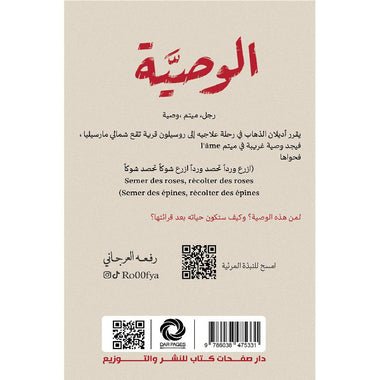 الوصية اسم المؤلف : رفعة العرجاني رجل، ميتم ،وصية يقرر أديلان الذهاب في رحلة علاجيه إلى روسيلون قرية تقع شمالي مارسيليا ، فيجد وصية غريبة في ميتم فحواها (ازرع ورداً تحصد ورداً ازرع شوكاً تحصد شوكاً لمن هذه الوصية؟ وكيف ستكون حياته بعد قرائتها؟