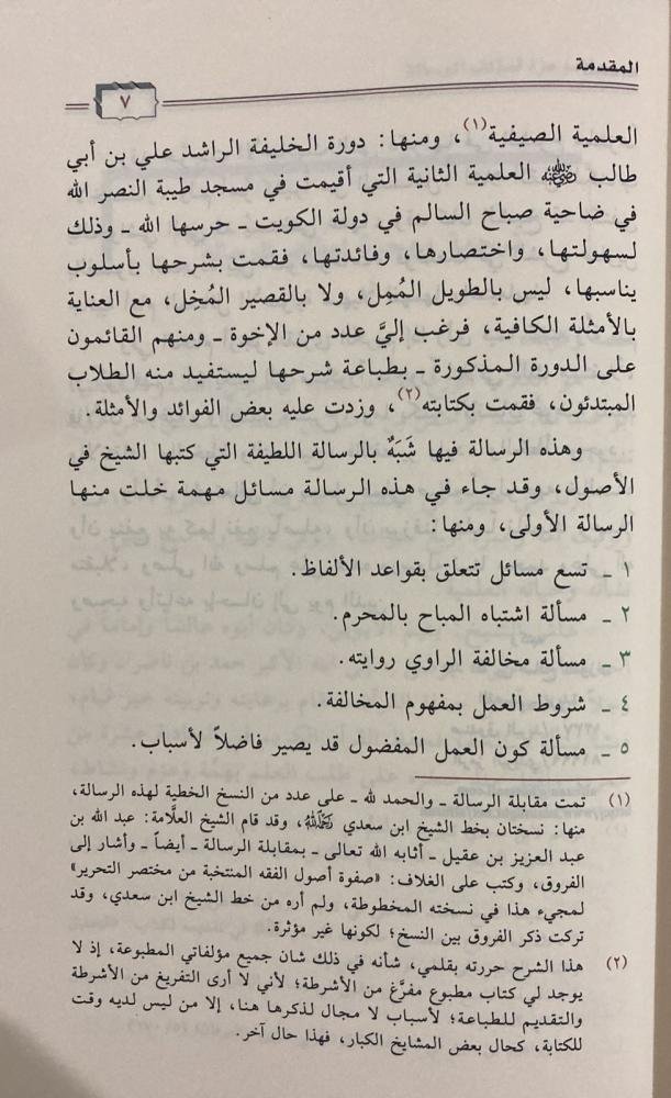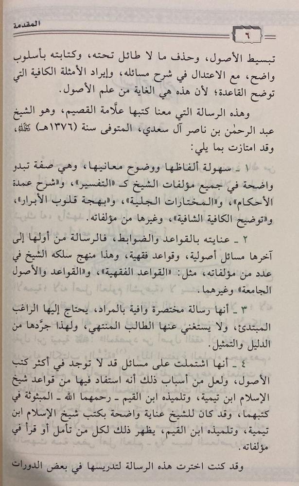 وقد كنت اخترت هذه الرسالة لتدريسها في بعض الدورات العلمية الصيفية (١) ، ومنها : دورة الخليفة الراشد علي بن أبي طالب الله العلمية الثانية التي أقيمت في مسجد طيبة النصر الله في ضاحية صباح السالم في دولة الكويت – حرسها الله ـ وذلك لسهولتها، واختصارها ،وفائدتها فقمت بشرحها بأسلوب يناسبها، ليس بالطويل المُمِل ، ولا بالقصير المُخِل، مع العناية بالأمثلة الكافية، فرغب إليَّ عدد من الإخوة – ومنهم القائمون على الدورة المذكورة – بطباعة شرحها ليستفيد منه الطلاب المبتدئون، فقمت بكتابته ، وزدت عليه بعض الفوائد والأمثلة. وهذه الرسالة فيها شَبَهُ بالرسالة اللطيفة التي كتبها الشيخ في الأصول، وقد جاء في هذه الرسالة مسائل مهمة خلت منها الرسالة الأولى، ومنها :