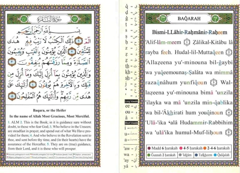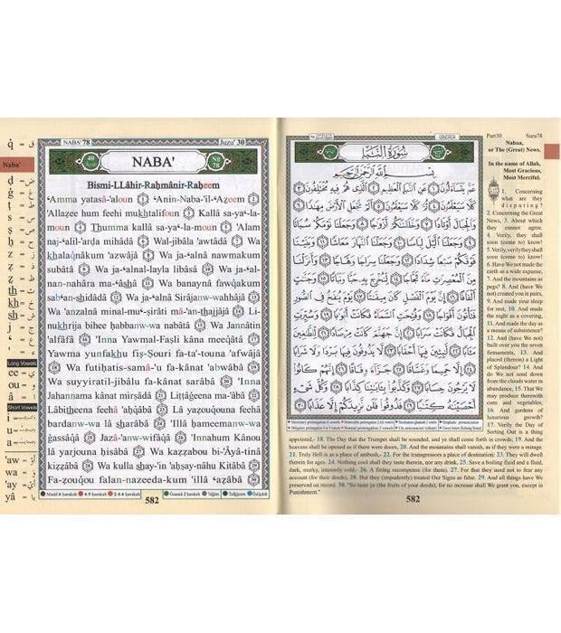 Tajweed Quran With English Translation and Transliteration Roman script مصحف التجويد ترجمة معاني القرآن الي الانجليزية مع الرسم الرومان مصحف التجويد مع المعاني الإنجليزية والترجمة بالحروف الرومانية مع فهرس موضوعات القرآن. الترجمة الإنجليزية لعبدالله يوسف علي و الترجمة الصوتية صبحي طه. تتم كتابة الترجمة الإنجليزية حول حدود النص العربي على الجانب الأيمن من الصفحة. يحتوي الجانب الأيسر من الصفحة على الترجمة الصوتية للغة العربية مع نطق الحروف على الجانب يبلغ ارتفاع النص العربي في هذا القرآن 1.0 سم (من أعلى الفتحة إلى أسفل الكسرة). يبلغ ارتفاع الصفحة الداخلية للنص العربي 17.2 سم (داخل حدود الصفحة). يبلغ طول صفحة التحويل الصوتي 20.7 سم (حد الصفحة الداخلية). مقدمة من الناشر أمرنا الله (سوا) في كتابه الكريم بتلاوة القرآن مع التجويد “تلاوة القرآن بتعديل”. يعمل نظام التجويد كدليل لتحسين أسلوب التلاوة القرآنية. وبهذه الطريقة نزل القرآن الكريم على النبي محمد (صلى الله عليه وسلم) وكذلك الطريقة التي تلاه بها. لذلك يتوق قارئ القرآن الكريم إلى تحقيق وعد النبي محمد (صلى الله عليه وسلم): “من قرأ القرآن بشكل صحيح ومهذب يكون مع الكتاب الأفاضل (ملائكة اللوح المحفوظ – اللوح المحفوظ). بناءً على الفهم العملي لعلم الأصوات ، قمنا بترميز أماكن بعض الأحرف بالألوان لتسهيل التلاوة الصحيحة للقرآن الكريم. وقد مكننا ذلك من تصنيف هذه الحروف ضمن 3 فئات ممكنة لتعزيز معرفة القارئ وتذكره بقواعد التجويد. الحروف التي تتطلب النطق الموسع. استخدمنا اللون الأحمر لإبراز هذه الحروف. الحروف التي هي أنف. هذه الحروف خضراء اللون. يشير اللون الأزرق الغامق إلى تأكيد الحرف (R) ، ويشير اللون الأزرق إلى عدم الاستقرار – صوت صدى الحروف- (كوالكوالا) بينما الحروف التي تكتب ولكن لم يتم نطقها. هذه الحروف رمادية اللون. سوف يعتاد القارئ على تلاوة القرآن باستخدام الألوان كما اعتاد على التوقف عند الأضواء الحمراء والمرور عبر الأضواء الخضراء. من خلال الانخراط في هذا العمل الرائع ، سيجده القارئ يطبق 24 قاعدة من قواعد التجويد بسهولة ودقة بينما يترك عقله حراً في التفكير وفهم معنى القرآن الكريم. Tajweed Qur’an with English meanings & Transliteration in Roman script with Qur’an topics index. English Translation by Abdullah Yusuf Ali and Transliteration by Subhi Taha. English translation is written around the border of the Arabic text on the right side of the page. The left side of the page contains the Transliteration of the Arabic with letter pronunciation on the side The Arabic line text in this Quran is 1.0cm high (from top fathah to bottom kasrah). The inside page height of the Arabic text is 17.2cm (inside the page border). The Transliteration page is 20.7cm (inside page border). Introduction from the Publisher ALLAH (SWA) ordered us in his holy book to recite the Quran with tajweed “recite the Quran modulatingly.” the system of tajwid serves as a guide to improve the style of Qur’anic recitation . It was in this way that the holy Quran was revealed to prophet Mohammed (PBUH) and also the manner in which he recited it. Therefore, the reader of the holy Quran longs to achieve the promise of Prophet Mohammed (PBUH): “whoever recites the Quran correctly and proficiently will be with the bountiful dutiful writers (the angels of the preserved tablet – Al lauh Al Mahfuz). Based on a practical understanding of phonology, we have color-coded the place of some letters to facilitate the correct recitation of the holy Quran. This had enabled us to classify these letters within 3 possible categories to enhance the reader’s knowledge and remembrance of tajweed rules. The letters which requires expanded vocalization. We used red color to highlight these letters. The letters which is nasalized. These letters are green in color. the dark blue color indicates the emphatic of the letter (R), the blue color indicates the unrest letters-echoing sound- (qualquala) While the letters which are written but are not pronounced. These letters are gray in color. The reader will get used to reciting the Quran by using color just as he got used to stopping at red lights and passing though green lights. By engaging I this sublime act, the reader will find him self applying 24 rules of tajweed with ease and precision while his mind is left free to contemplate and understand the meaning of holy Quran.