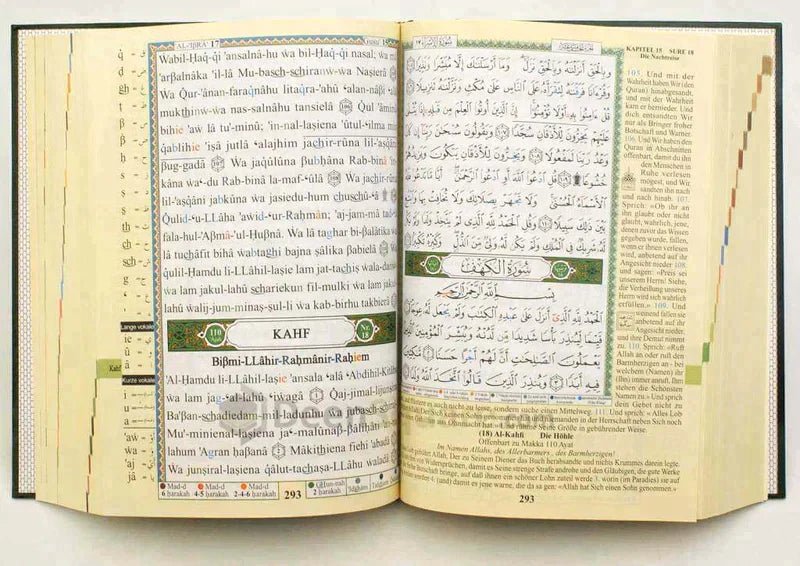 مصحف التجويد وترجمة معانية الي اللغة الالمانية Tajweed Quran with Meanings Translation and Transliteration German يأتي مصحف التجويد الكامل المرمز بالألوان هذا بغلاف صلب جميل ، ويتضمن ترجمات وتحويلًا صوتيًا إلى اللغة الألمانية. الترجمة: تُرجمت معاني القرآن مقابل النص إلى اللغة الألمانية وتوضع على هوامش النص العربي. الترجمة الصوتية: يتم تقديم الحروف العربية بأحرف ألمانية مع رموز مضافة لإعطاء نفس صوت الأحرف العربية. تسهل الترجمة الصوتية الألمانية على المتحدثين باللغة الألمانية قراءة مصحف التجويد بالنطق العربي باستخدام الحروف الأبجدية الألمانية This complete Color Coded Tajweed Quran comes with a nice and beautiful hard cover, it includes translations and transliteration into German. Translation: meanings of the Quranic versus are translated into German and placed on the margins around the Arabic text. Transliteration: Arabic letters are presented by German letters with added symbols in order to give the same sound of Arabic letters. German transliteration makes it easier for the speakers of the German language to read the Tajweed Quran in Arabic pronunciation using the German alphabet letters. Based on a practical understanding of phonology, we have color-coded some letters to facilitate the correct recitation of the holy Quran. This enabled us to classify these letters into three possible categories to enhance the reader’s knowledge and remembering of Tajweed rules: – The letters which requires expanded vocalization. We used red color to highlight these letters. – The letters which are nasalized these letters are green in color. – The dark blue color indicates the emphasis of the letter (R), the blue color indicates the unrest letters-echoing sound- (qualquala) – While the letters which are written but are not vocalized. These letters are gray in color. The reader will get used to reciting the Quran by using colors very easily. By engaging the eye, the reader will find him/herself applying 24 rules of Tajweed with ease and precision while his/her mind is left un-enganged to comprehend and understand the meaning of the holy Quran. For more details click here This Tajweed Quran is in Hafs narration. Tajweed Quran products -including this Quran- come with the following: Color coded letters: to present the Tajweed rules, very good and simple way to learn and apply Tajweed rules. Obvious script: extra spaces were added between the words in order to make it easier to read and recite the Quran. Permissible stops: long spaces were added at certain places where it is permissible to stop. It helps to avoid stopping at wrong places or times. A set of very useful indexes such as: Surahs Color Index, Subject Index. Tajweed rules explained in details with helpful illustration.