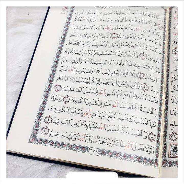 مصحف بالرسم العثماني مخمل لون زهري ورق المدينة مقاس 14×20 سم Qur’an Uthmani Script Velvet Cover size A5 14×20 cm Baby Pink color