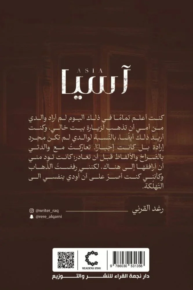 اسيا اسم المؤلف : رغد القرني كنت أعلم تمامًا في ذلك اليوم لم أراد والدي من أمي أن تذهب لزيارة بيت خالي، وكنت أريد ذلك أيضًا، بالنّسبة لوالدي لم تكن مجرد إرادة بل كانت إجبارًا. تعاركتُ مع والدتي بالصّراخ والألفاظ قبل أن تغادر؛ كانت تود مني أن أرافقها إلى هناك، لكنني رفضتُ الذّهاب وكأنني كنت أصرّ على أن أُودي بنفسي الى التّهلُكة.