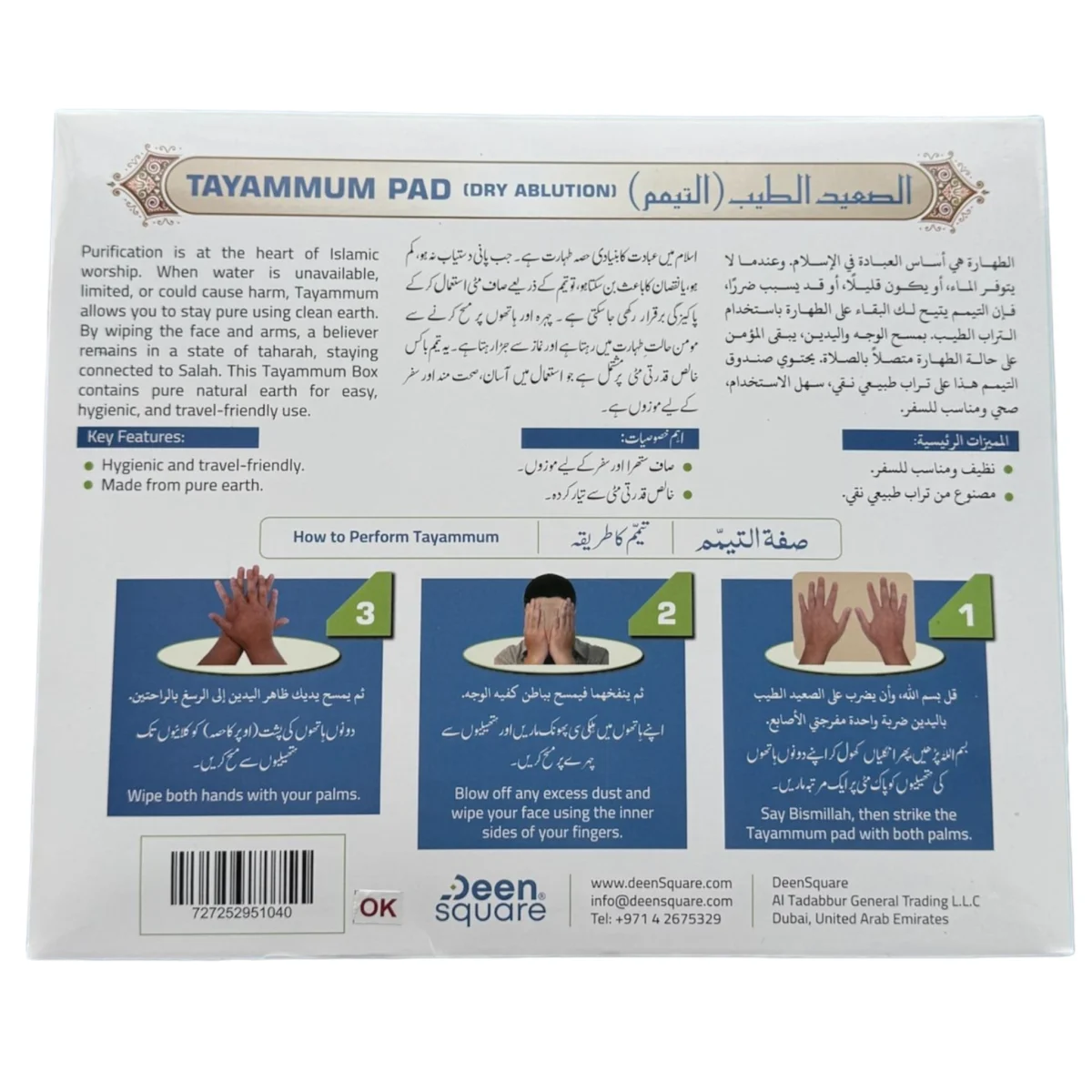 الطهارة ركن أساسي في الإسلام، وهي مرتبطة بالصلاة. صندوق التيمم هذا يُستخدم للعبادة. عندما يكون الماء غير متوفر، أو محدودًا، أو قد يُسبب ضررًا، يُتيح التيمم الحفاظ على الطهارة باستخدام التراب النظيف. بمسح الوجه والذراعين، يبقى المؤمن في حالة طهارة، ويبقى في حالة طهارة، حيث يحتوي على تراب طبيعي نقي لسهولة الاستخدام، والنظافة، وسهولة الحمل.