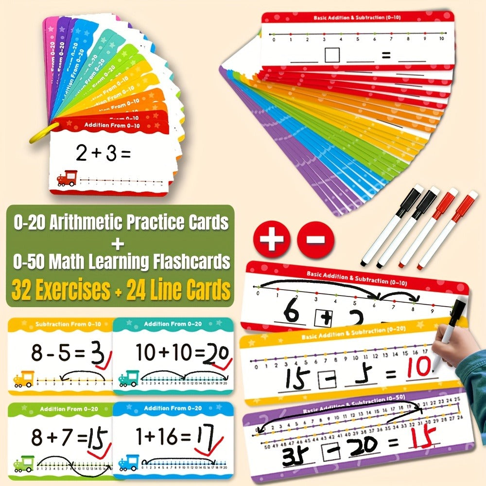 مارس الرياضيات بطريقة ممتعة وقابلة لإعادة الاستخدام مع بطاقاتنا الحسابية القابلة للمسح! تتيح كل بطاقة للأطفال الكتابة وحل المسائل ومسحها مرارًا وتكرارًا، مما ينمي مهاراتهم في الحساب والجمع والطرح. مثالية للأيدي الصغيرة، فهي تجعل التعلم تفاعليًا وسهلًا، وتعزز الثقة في الرياضيات المبكرة.