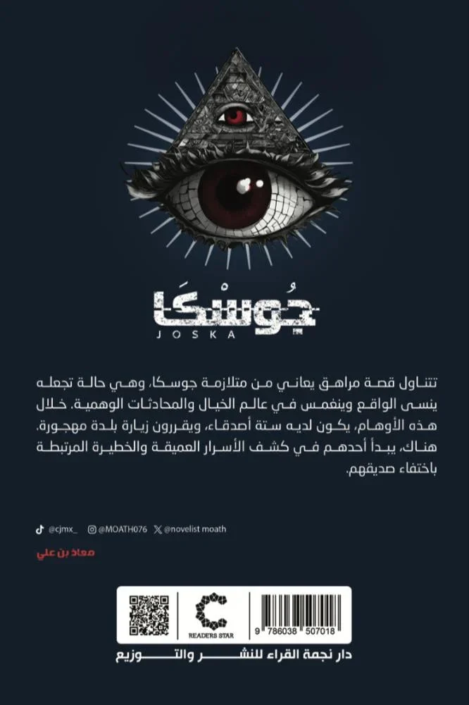 جوسكا اسم المؤلف : معاذ بن علي تتناول قصة مراهق يعاني من متلازمة جوسكا، وهي حالة تجعله ينسى الواقع وينغمس في عالم الخيال والمحادثات الوهمية. خلال هذه الأوهام، يكون لديه ستة أصدقاء، ويقررون زيارة بلدة مهجورة. هناك، يبدأ أحدهم في كشف الأسرار العميقة والخطيرة المرتبطة باختفاء صديقهم.