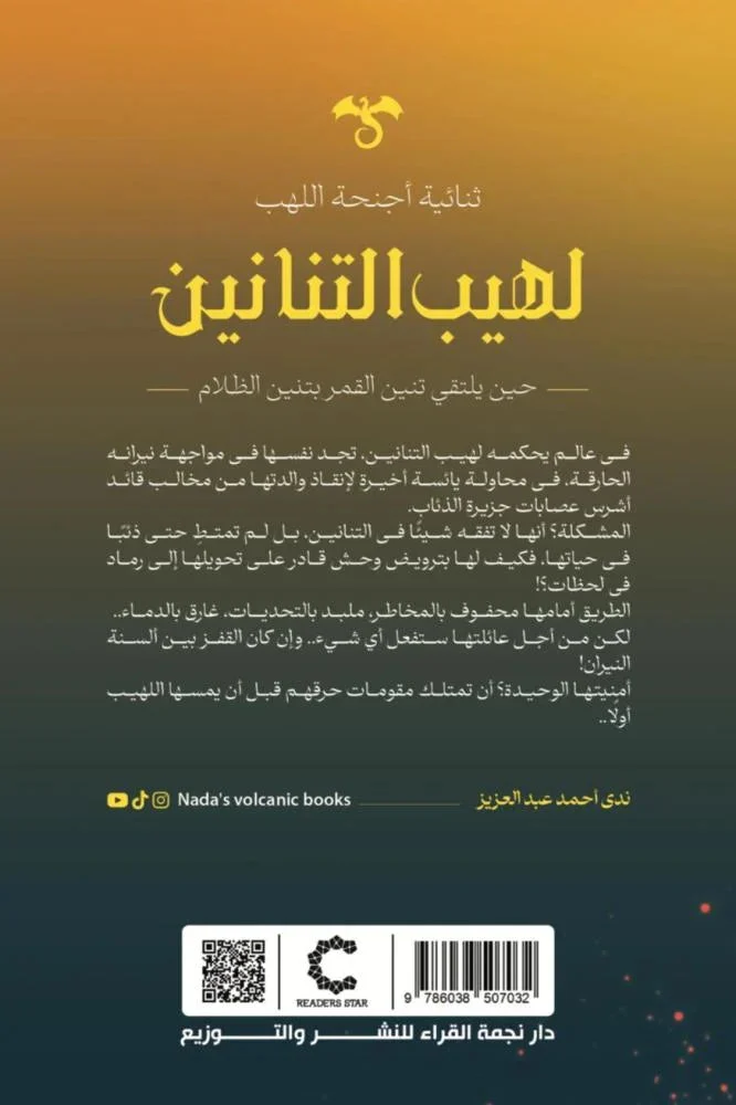 لهيب التنانين اسم المؤلف : ندى أحمد عبدالعزيز فى عالم يحكمه لهيب التنانين، تجد نفسها فى مواجهة نيرانه الحارقة، فى محاولة يائسة أخيرة لإنقاذ والدتها من مخالب قائد أشرس عصابات جزيرة الذئاب. المشكلة؟ أنها لا تفقه شيئًا فى التنانين، بل لم تمتطِ حتى ذئبًا فى حياتها، فكيف لها بترويض وحش قادر على تحويلها إلى رماد فى لحظات؟! الطريق أمامها محفوف بالمخاطر، ملبد بالتحديات، غارق بالدماء.. لكن من أجل عائلتها ستفعل أي شيء.. وإن كان القفز بين ألسنة النيران! أمنيتها الوحيدة؟ أن تمتلك مقومات حرقهم قبل أن يمسها اللهيب أولًا..